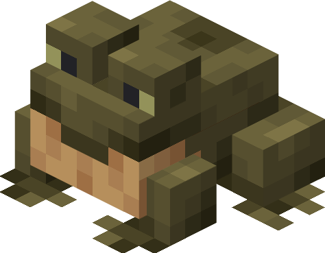 A frog is a passive mob found in swamps. Frogs eat small slimes and magma cubes. A frog can produce one of three kinds of froglights from eating magma cubes, depending on the type of frog. More..
